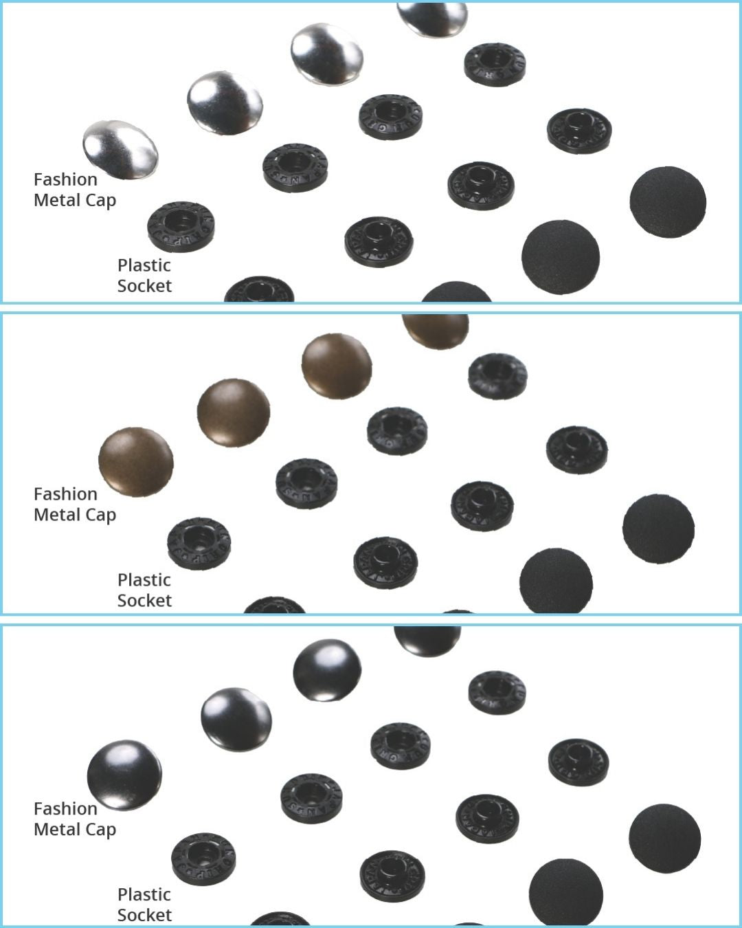 The fashion metal caps of ByAnnie's Tool-Free Snaps are available in three metal finishes (Antique Brass, Black Metal, and Nickel). Match them with ByAnnie's other metal hardware for a coordinated look.